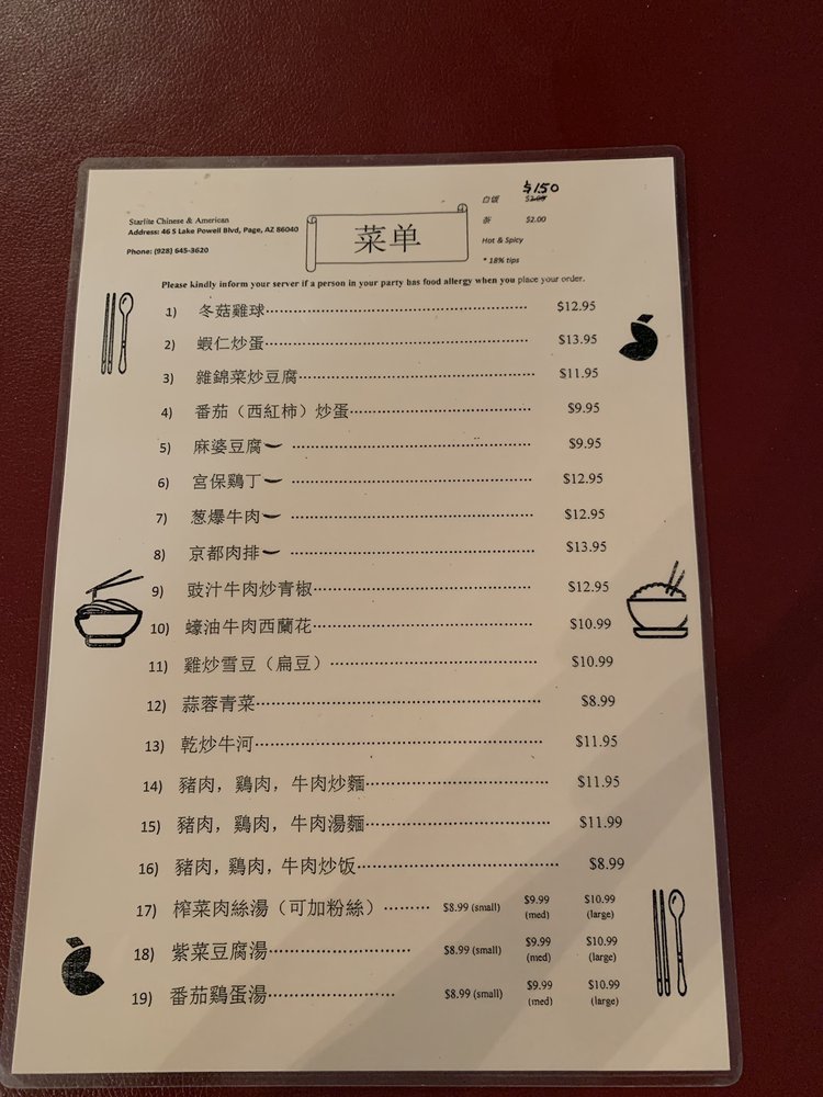 Welcome to Starlight, a delightful Chinese-American dining experience located in Page, AZ. Known for its vibrant flavors and generous portions, Starlight offers a diverse menu that caters to various preferences, including vegan and many vegetarian options.